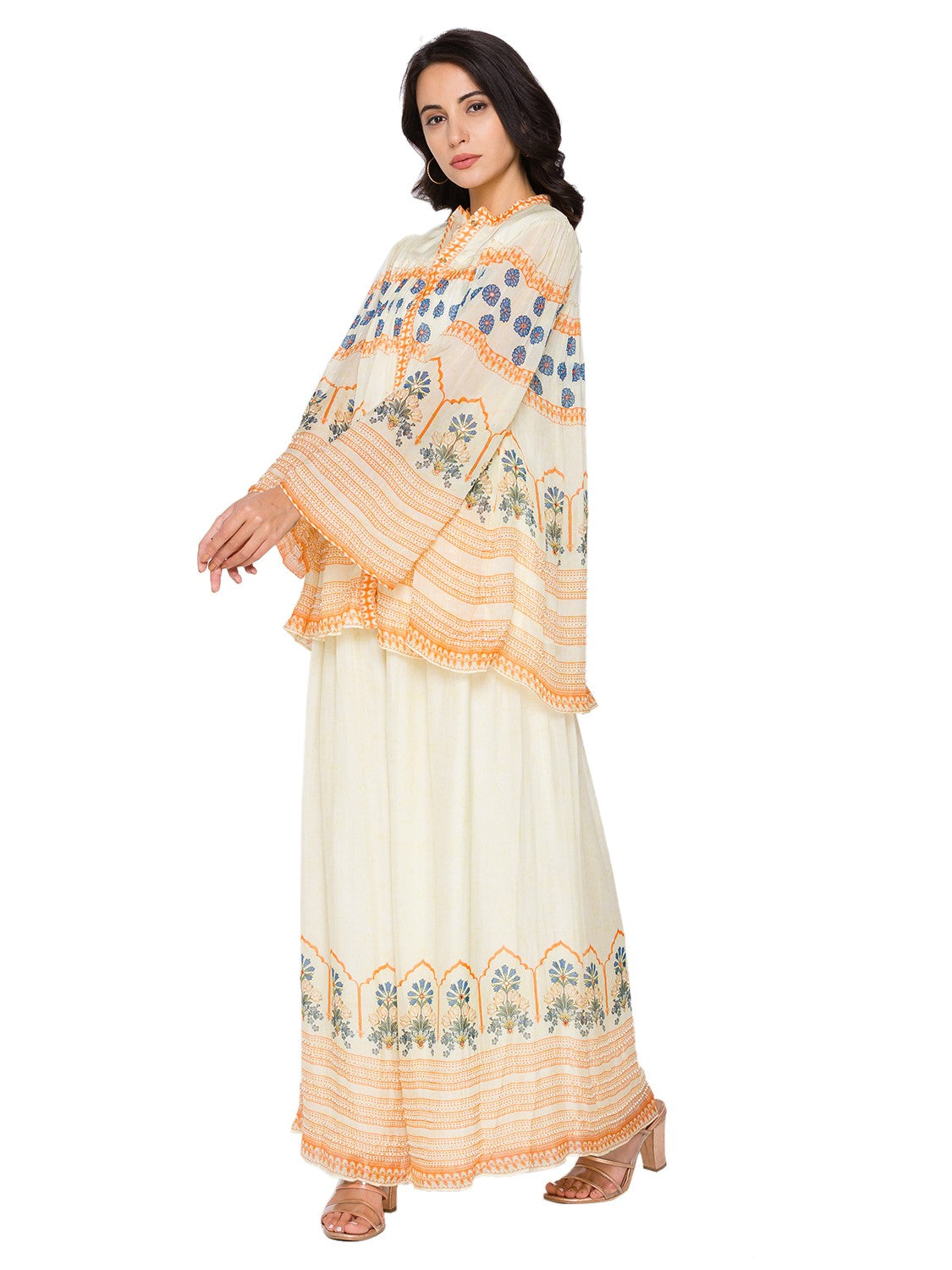 Eden Printed Short Top With Gathers Above Bust Paired With Pants And Embellished With Pearls
